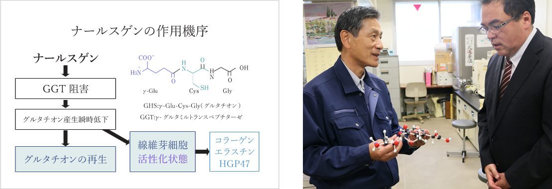 京都大学と大阪市立大学の共同研究で見出された、肌に塗布することで細胞を刺激し、コラーゲンやグルタチオンといった人体に重要な物質を産生させる革新的なスキンケア素材「ナールスゲン」。この「ナールスゲン」を使った化粧品の製造・販売を行っているベンチャー企業です。